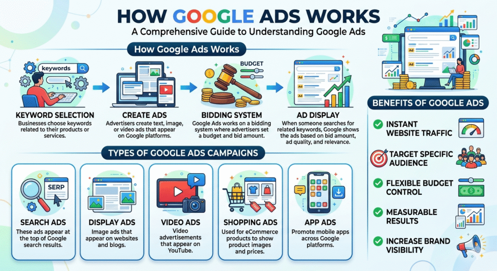 Learn how Google Ads works, types of campaigns, benefits, and tips to run successful advertising campaigns on Google.Keywords: